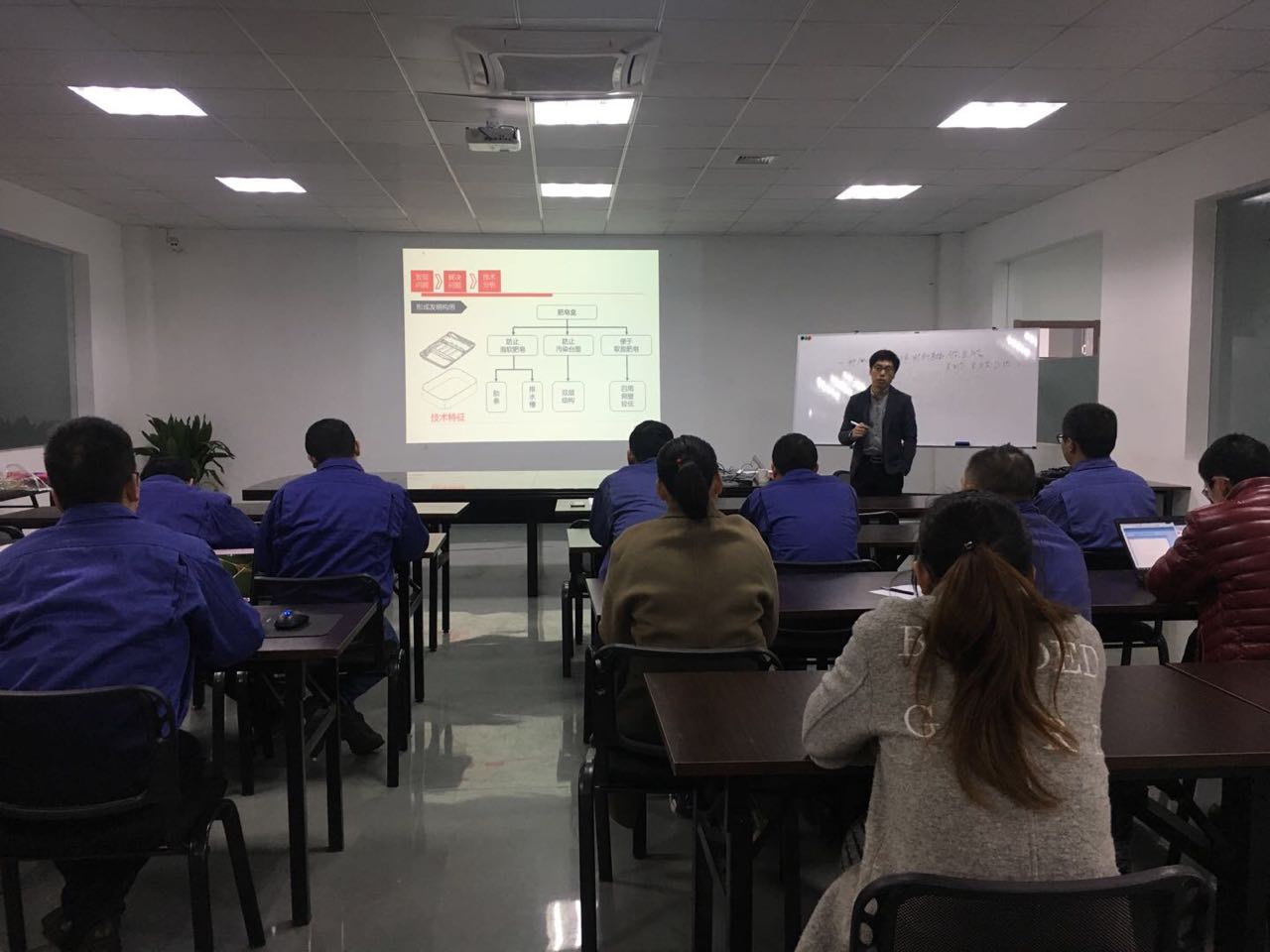 公司中高層管理人員悉數(shù)到位,蔣老師先就行業(yè)專利申請量、國家知識產(chǎn)權(quán)局機構(gòu)改革、專利法的修訂,以及知識產(chǎn)權(quán)審查等知識產(chǎn)權(quán)背景和發(fā)展趨勢進行了詳細的介紹,并與各部門領(lǐng)導在產(chǎn)品生產(chǎn)和銷售、人事管理、侵權(quán)金額判定、專利申請時機的把握和軟件著作權(quán)等方面進行了交流。在對技術(shù)人員的培訓會上,重點介紹了專利技術(shù)方案的挖掘方法和步驟,教大家如何判定專利侵權(quán)和如何規(guī)避設(shè)計等專業(yè)知識。參培人員積極參與互動交流,認真學習,培訓目標圓滿完成。